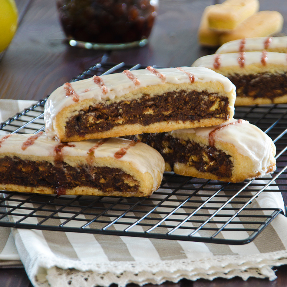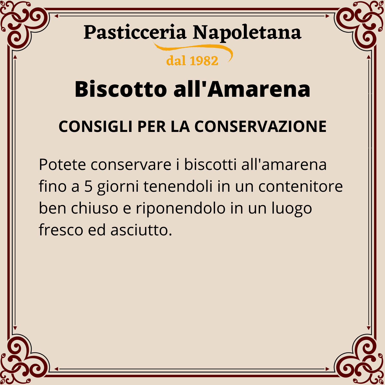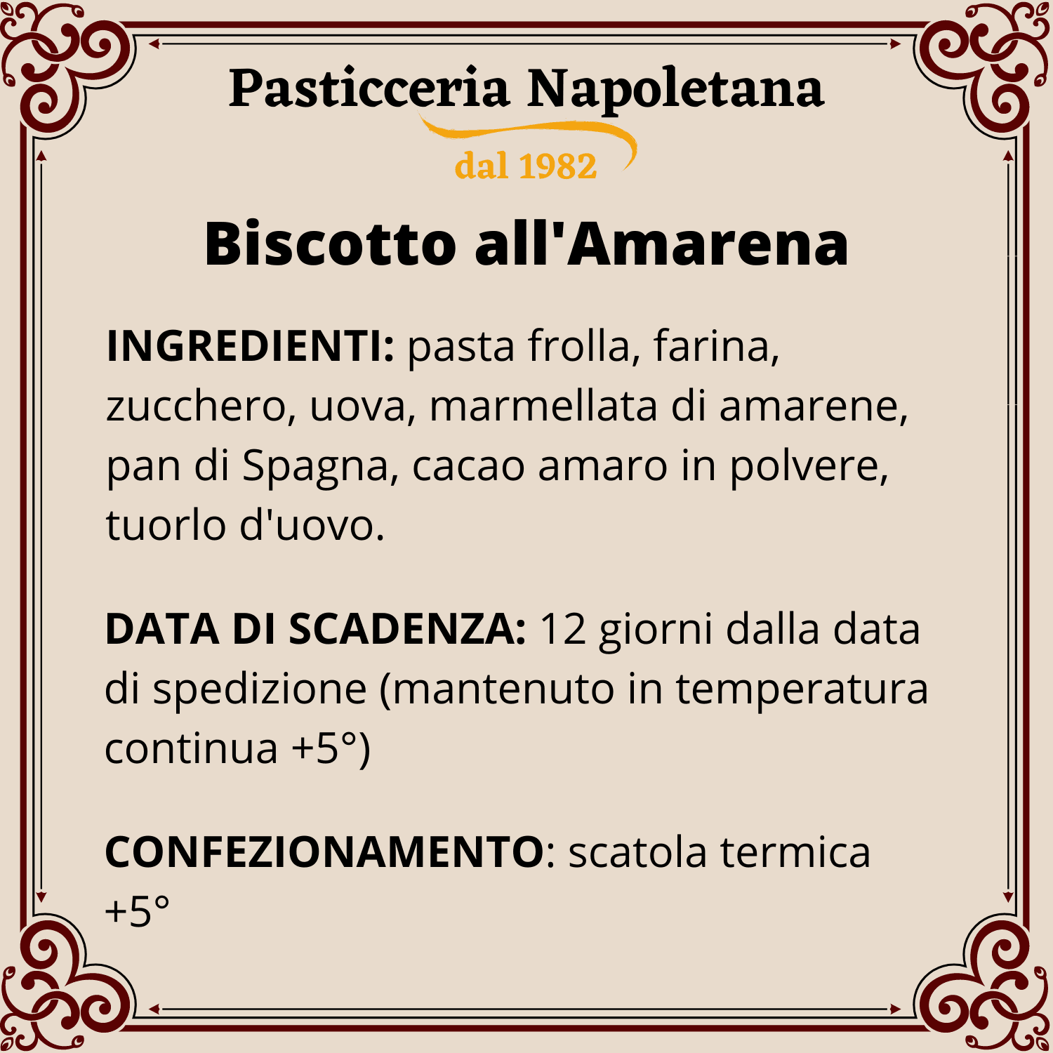 Il biscotto all’amarena è l’unico di origine 100% napoletana ed è presente nei bar, nei panifici e nelle pasticcerie. Sono fatti con una pasta frolla classica che contiene un impasto di pan di Spagna sbriciolato e mescolato a cioccolato, cacao, nocciole, marmellata di amarene...insomma, un tripudio di gusti che si sposano a meraviglia! La ricetta è preparata artigianalmente e con materie prime di qualità e a Km 0. Senza aggiunta di conservanti e coloranti.