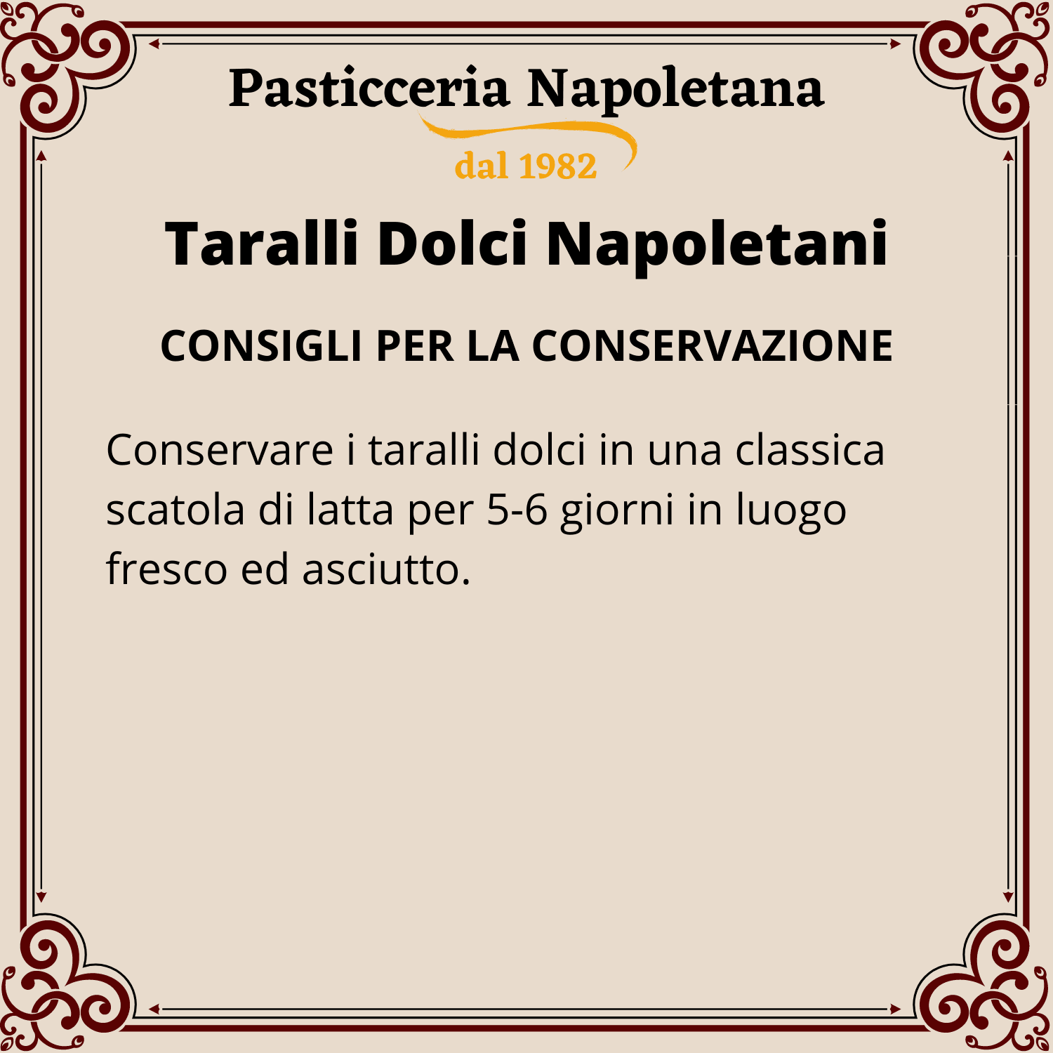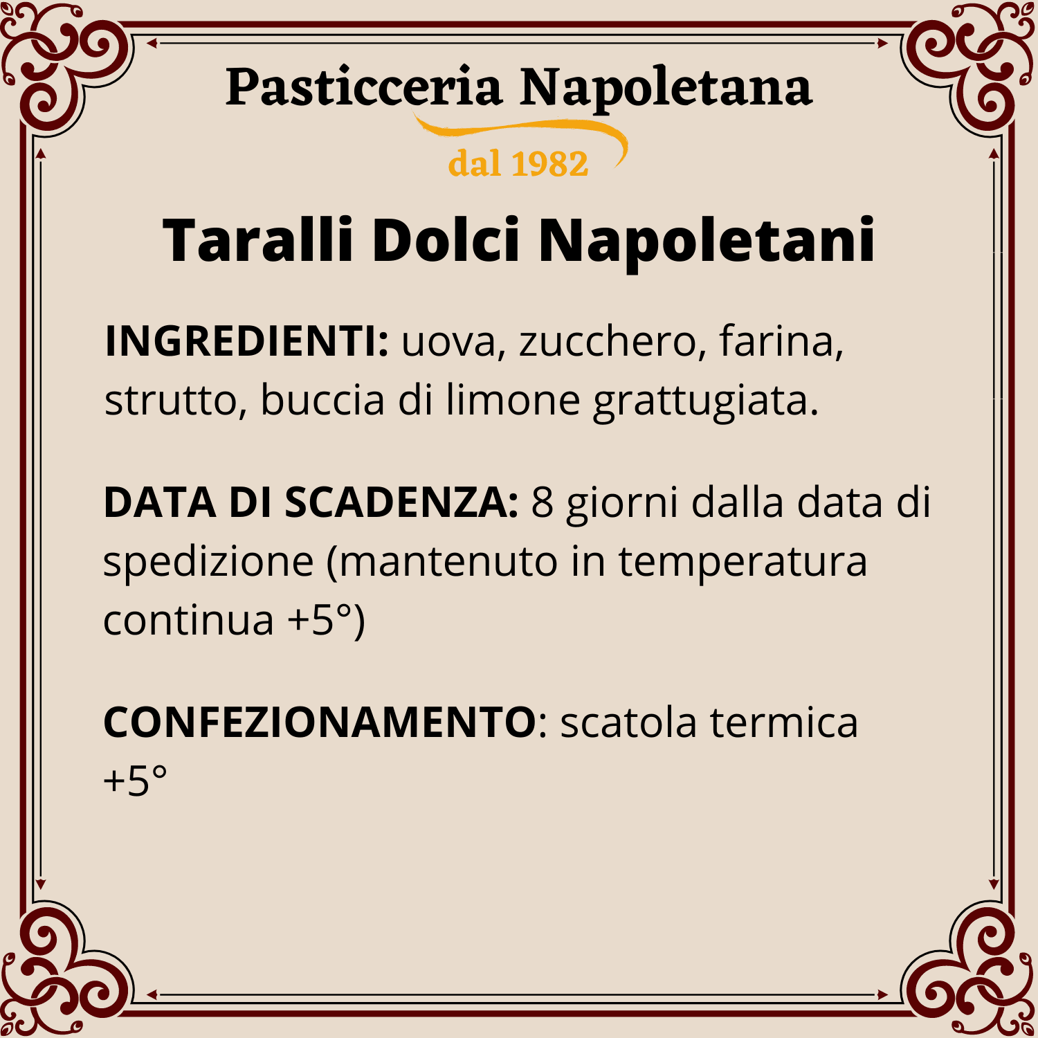 I taralli dolci napoletani, sono dolci tipici del periodo pasquale. Si preparavano con la pasta frolla avanzata della pastiera. Questi taralli, hanno una forma a ciambella e sono molto friabili, perché nell'impasto si utilizza lo strutto che li mantiene morbidi. Ottimi per la colazione, da inzuppare nel latte, o all’ora del tè, hanno un profumo molto particolare di vaniglia. Prodotti artigianalmente con l'antica ricetta della nonna, con solo ingredienti genuini. Senza aggiunta di conservanti e coloranti.